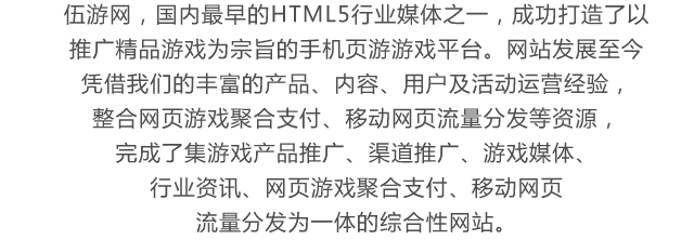 伍游网,国内最早的HTML5行业媒体之一,成功打造了以推广精品游戏为宗旨的手机页游游戏平台。网站发展至今凭借我们的丰富的